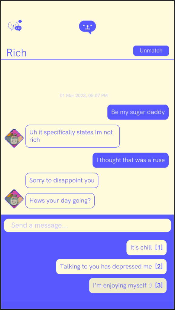 Tender is an intergalactic dating simulator where you take on the role of a traveling recently single astronaut. The idea was inspired by my own adventures attempting to date in NYC on the numerous available apps.